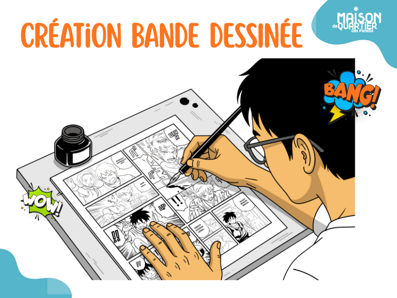 Un atelier créatif animé par Adrien pour découvrir les bases de la bande dessinée : personnages, narration et illustration. Les participants laissent libre cours à leur imagination.